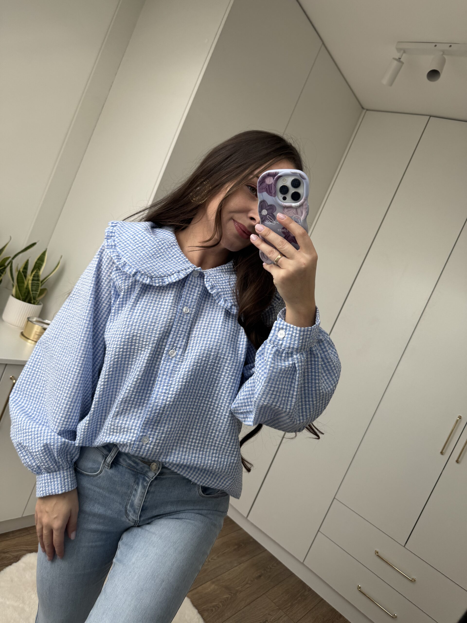 Ta koszula to subtelne połączenie klasyki i delikatnej elegancji. Wykonana z miękkiego, przyjemnego w dotyku materiału, pokryta jest delikatnymi prążkami, które nadają jej lekkości i stylowego charakteru. Ozdobny kołnierzyk z falbanami dodaje kobiecego uroku i finezji.