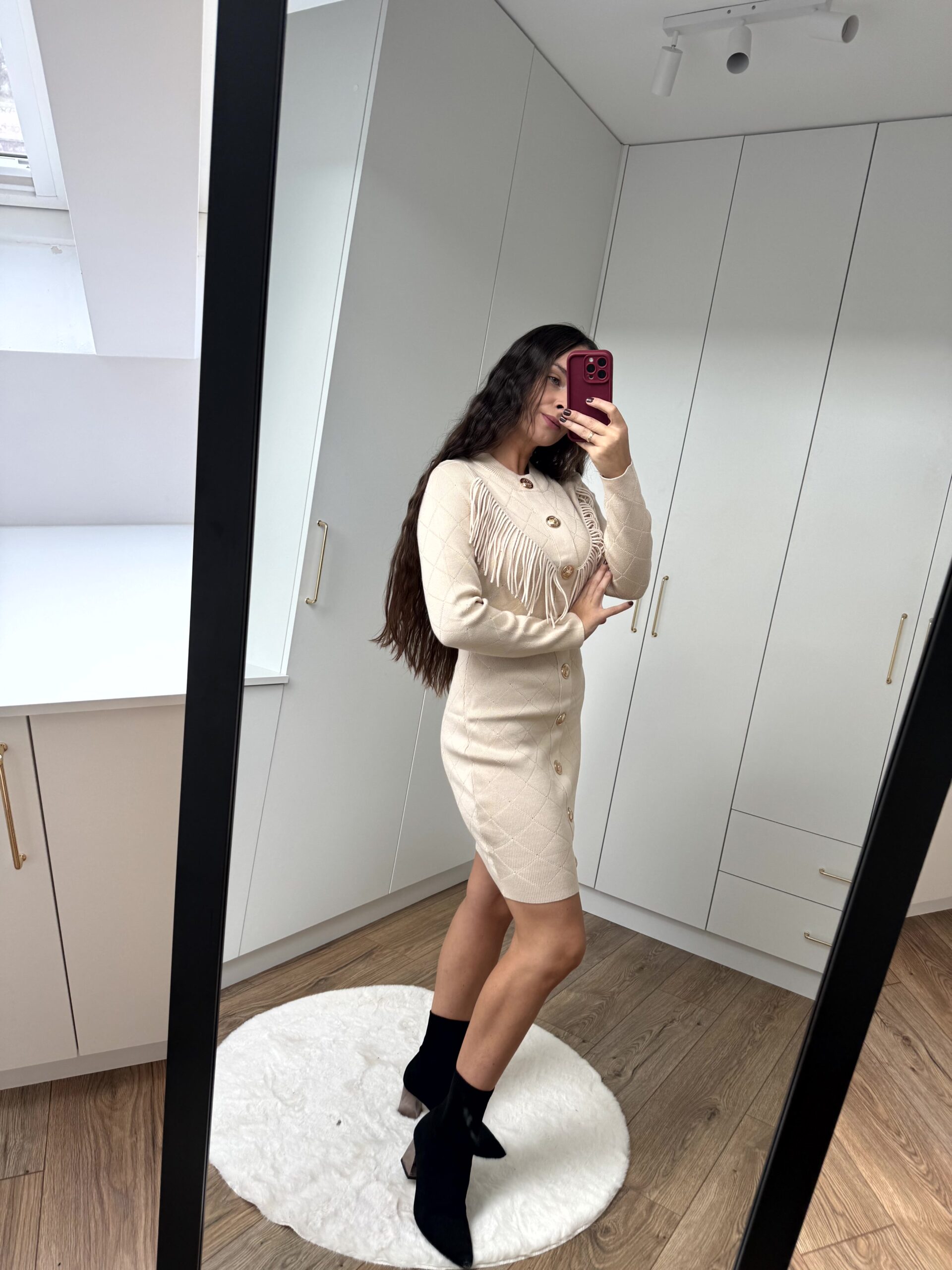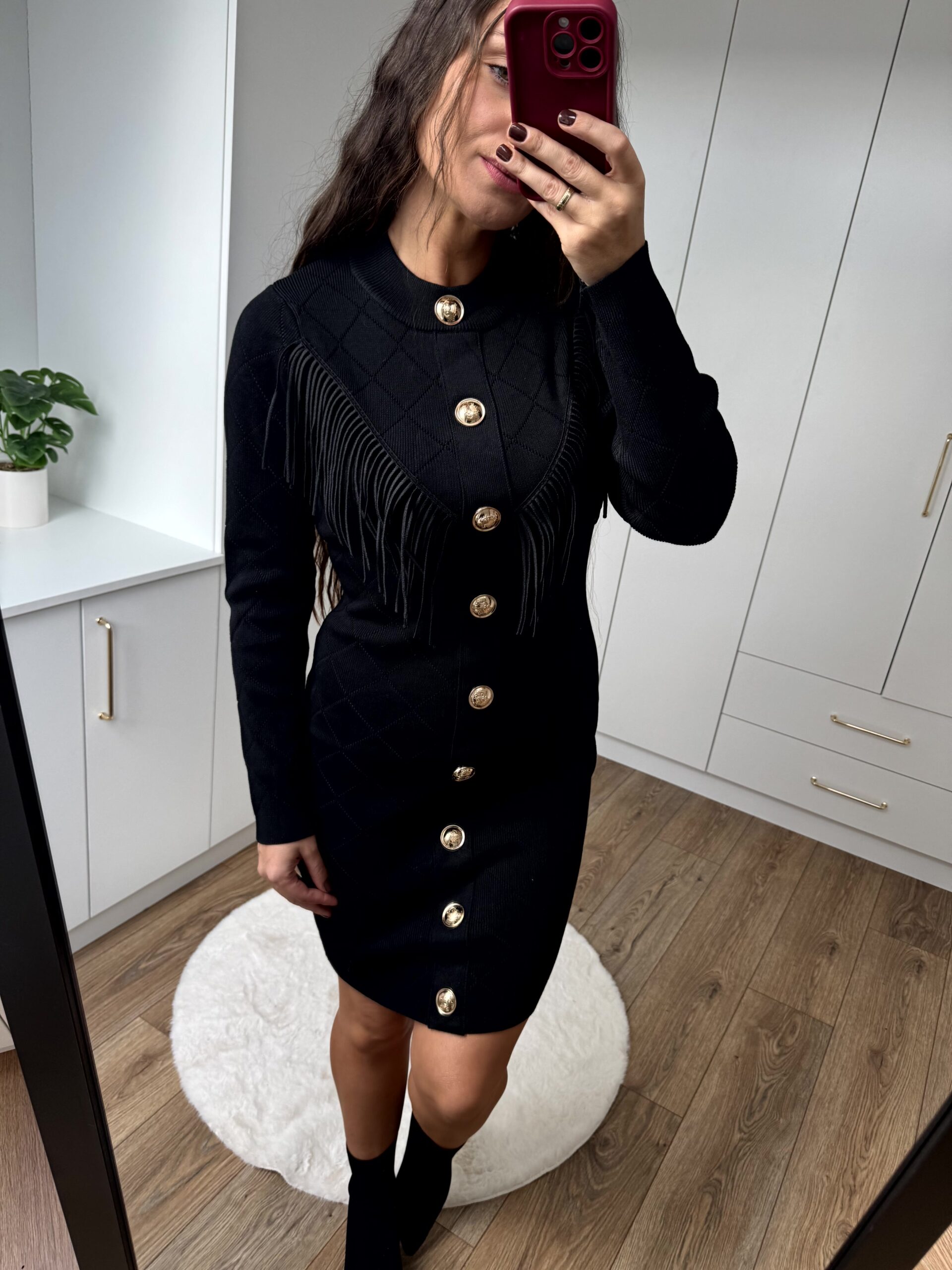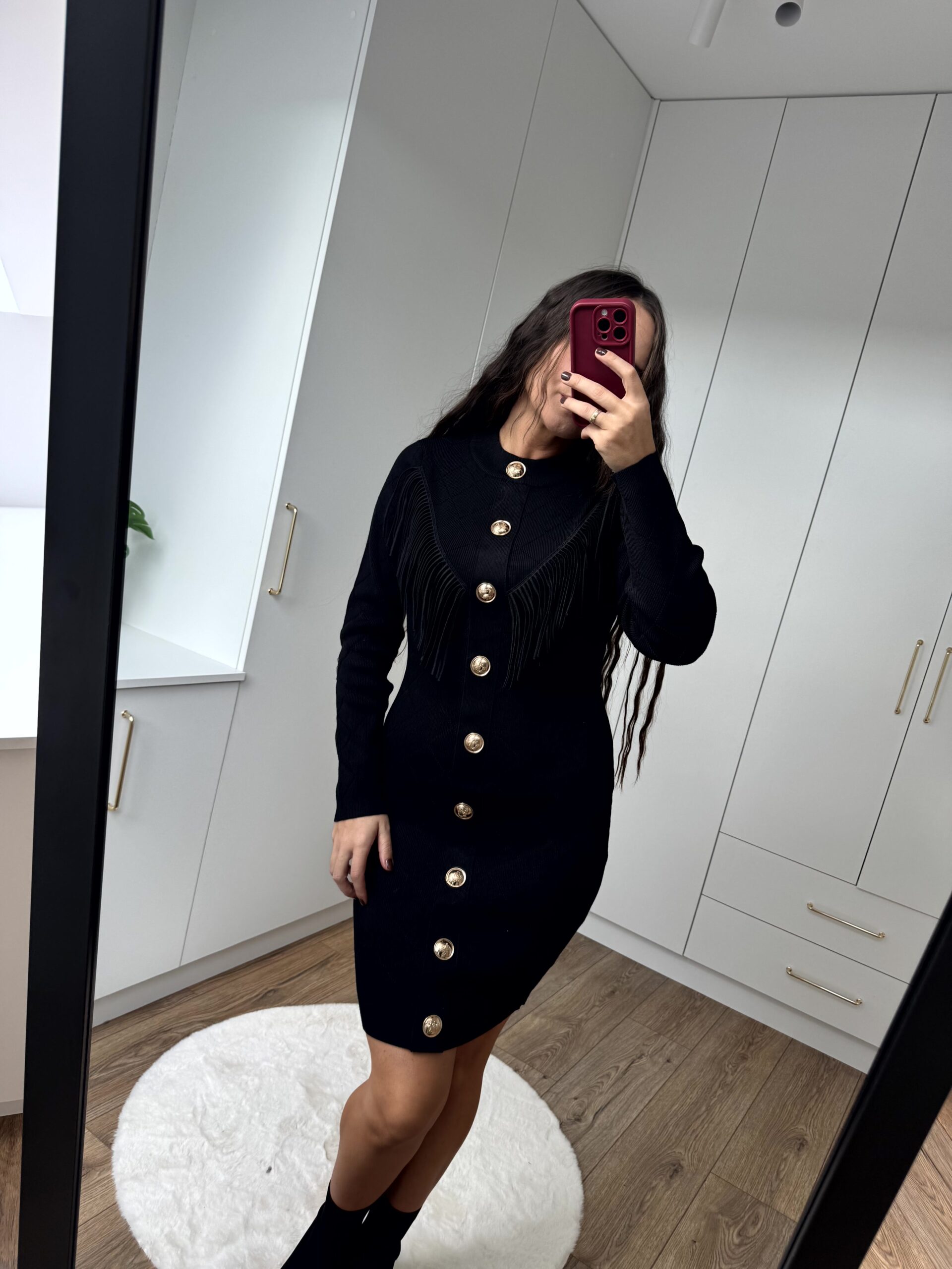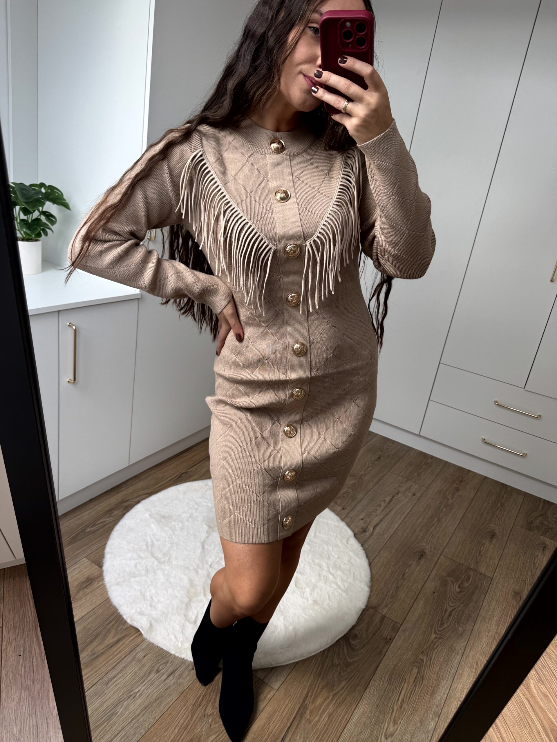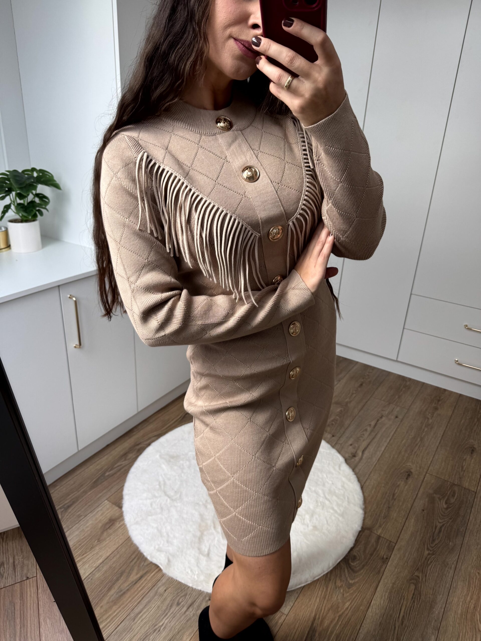 Sukienka mini z ozdobnymi frędzlami. Przepiękny, grubszy materiał, bardzo rozciągliwy– idealnie dopasowuje się do sylwetki.