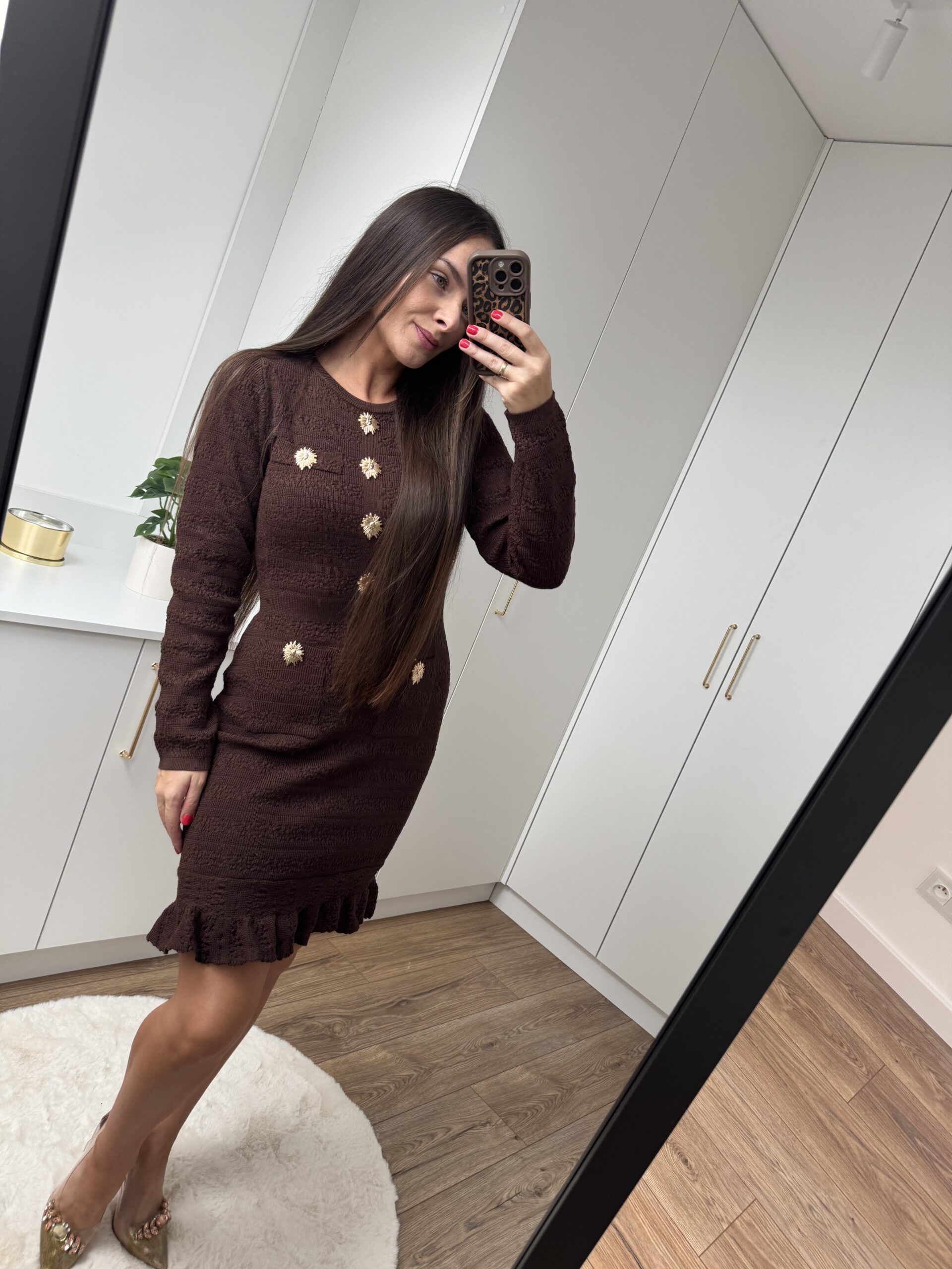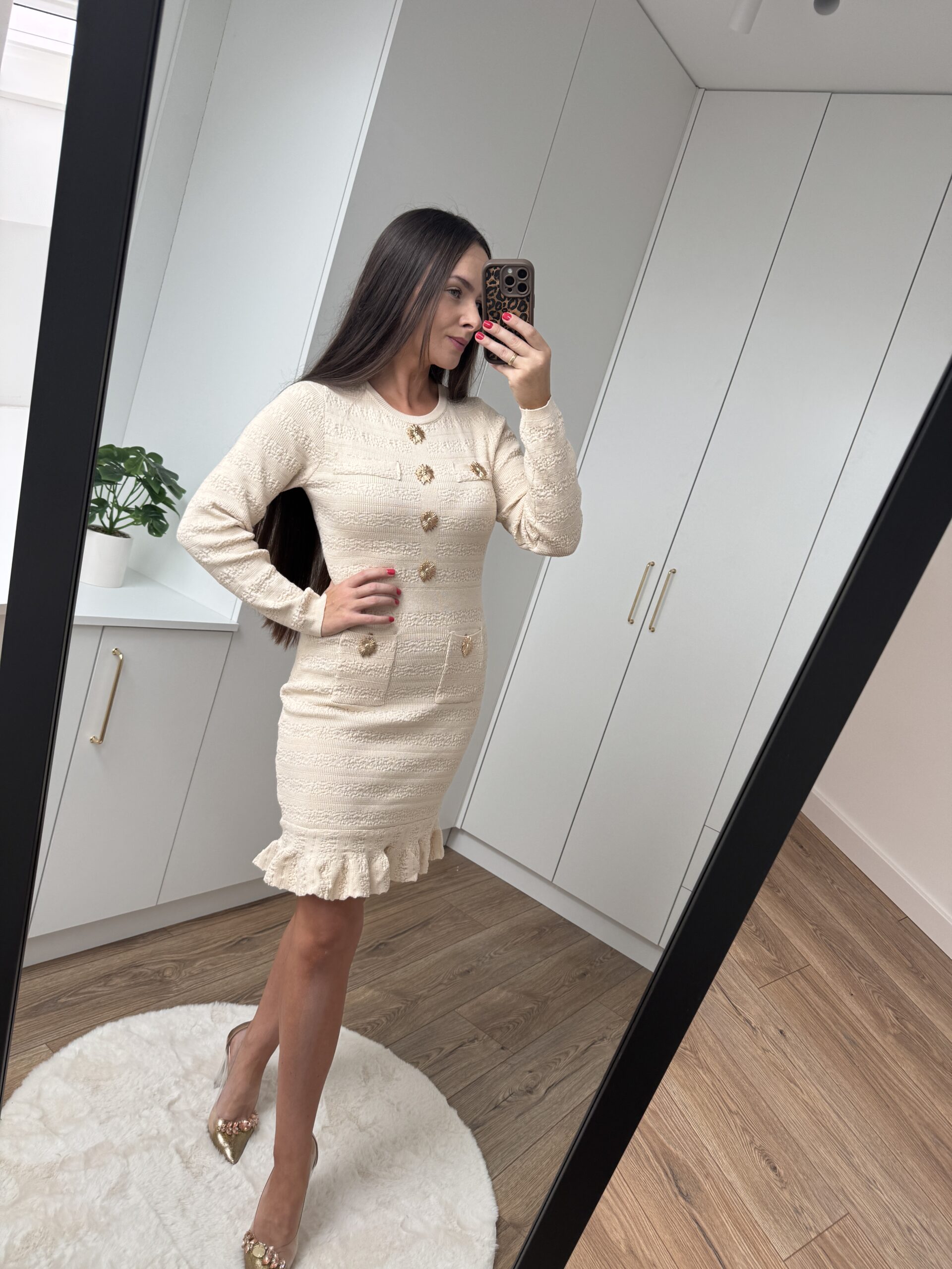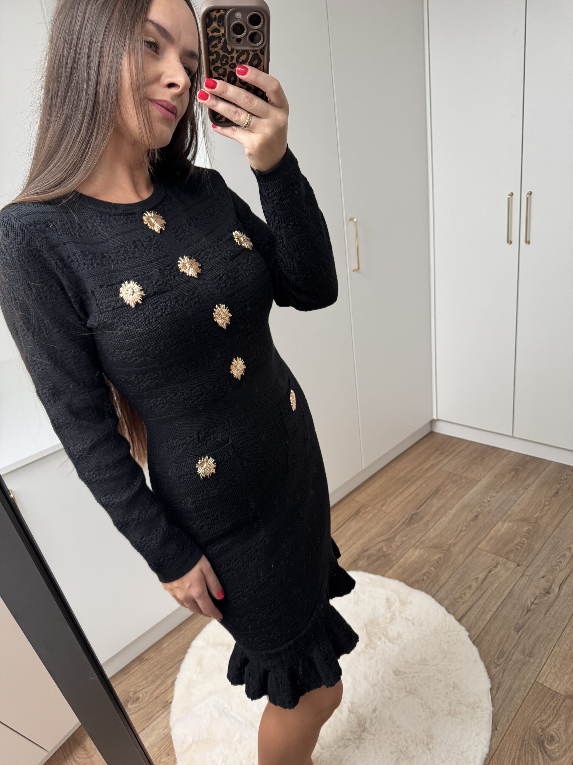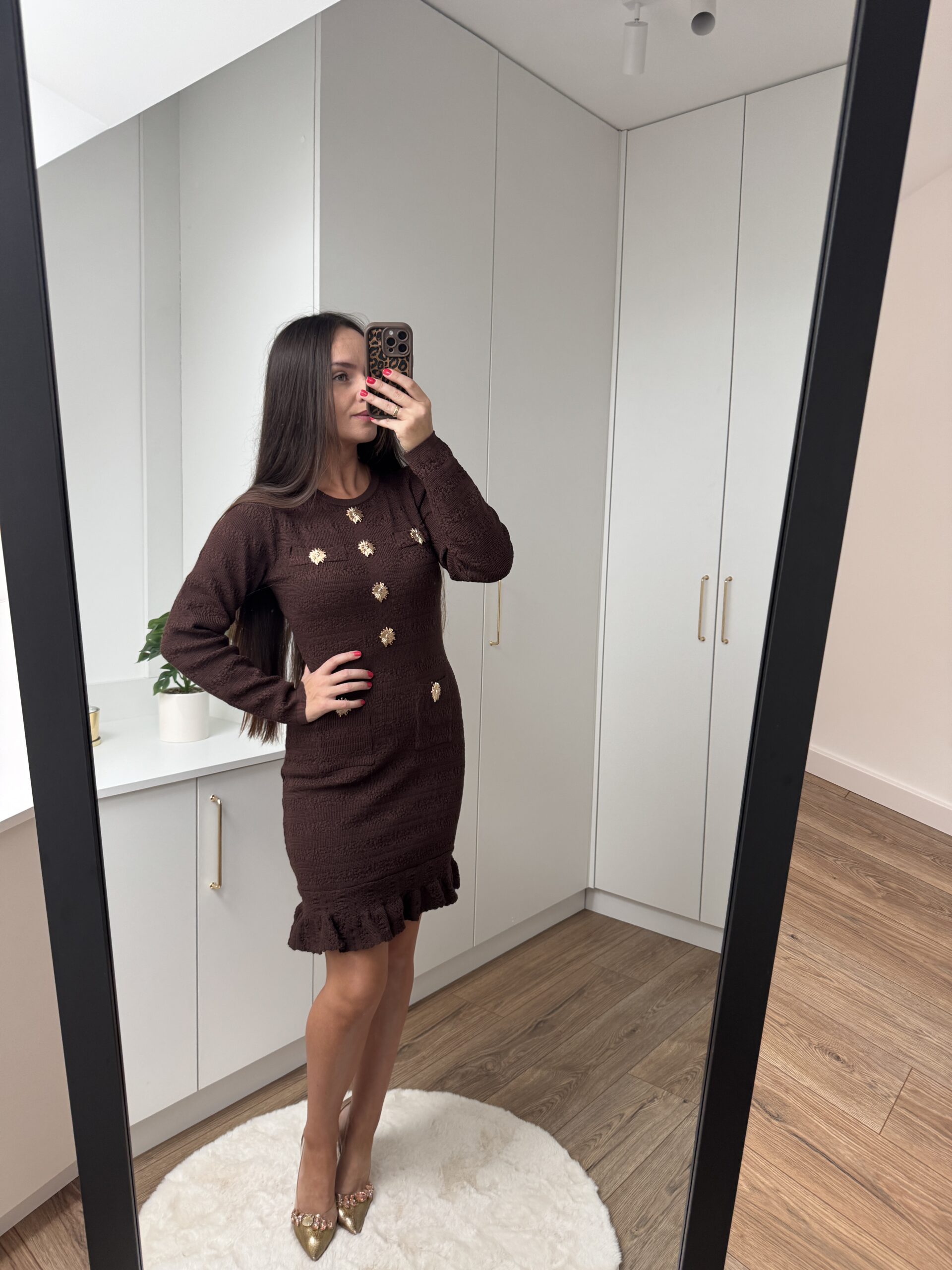 Sukienka z ozdobnymi guzikami w kolorze złota. Bardzo kobieca- przez swój taliowany krój.