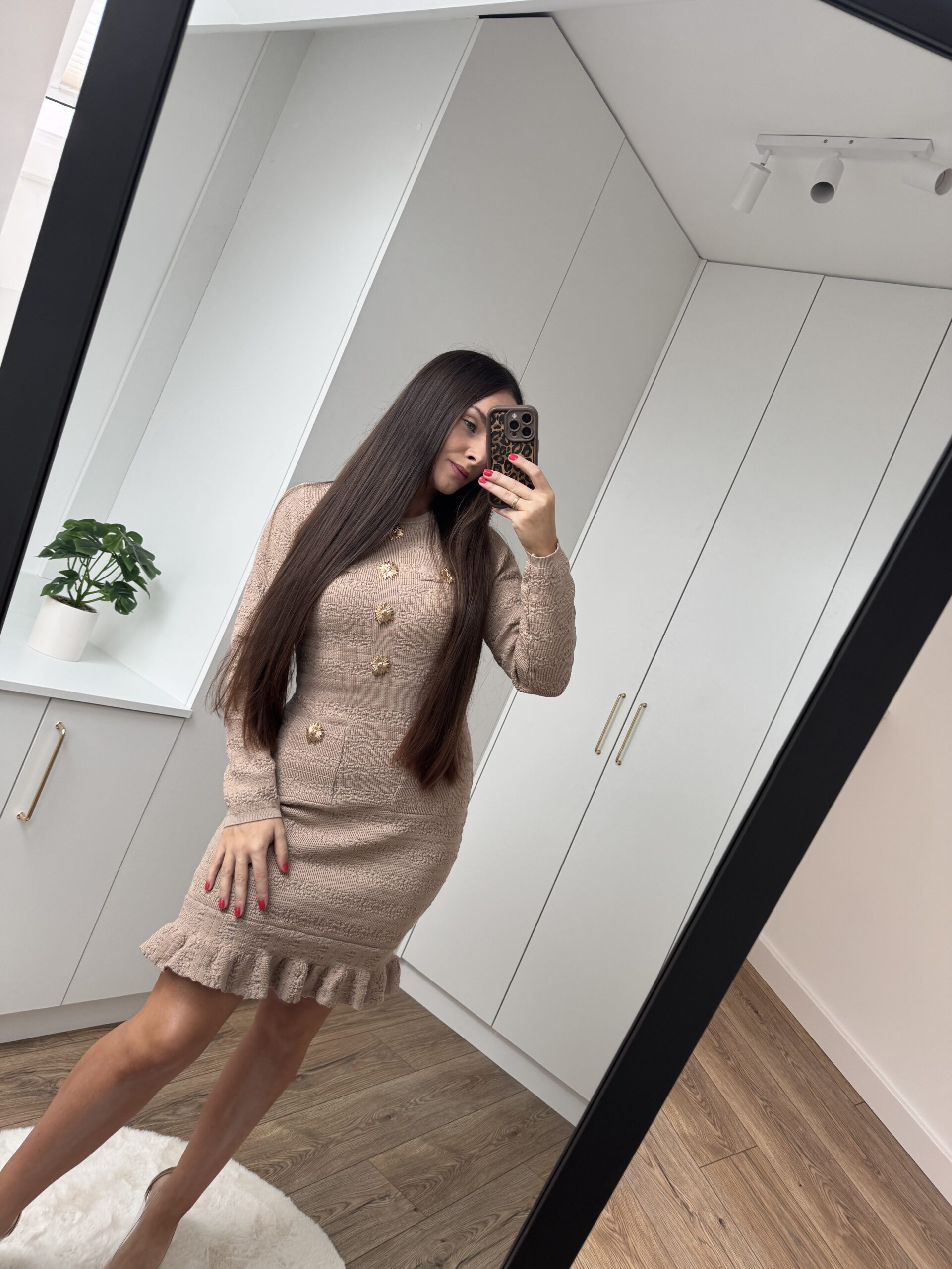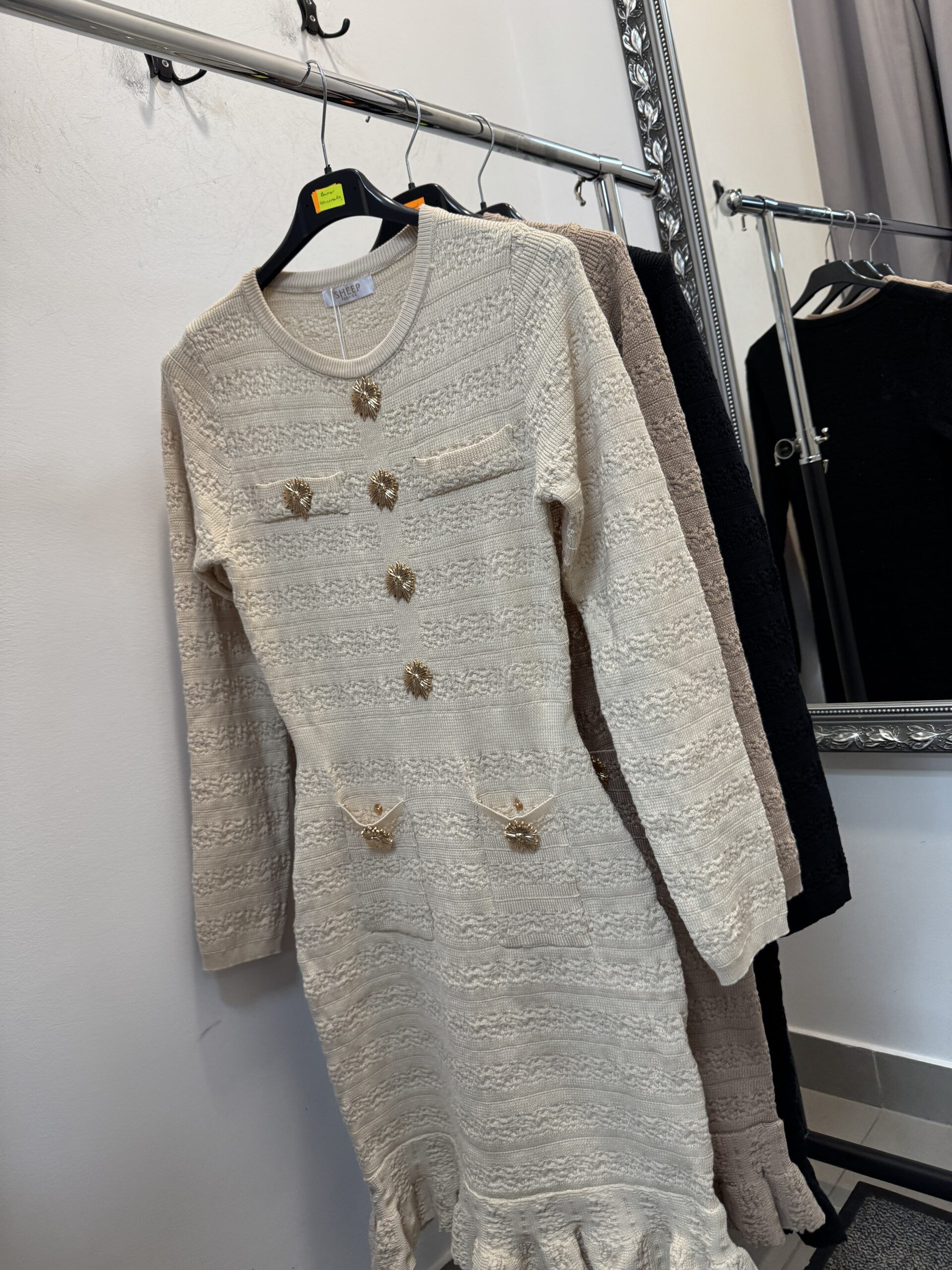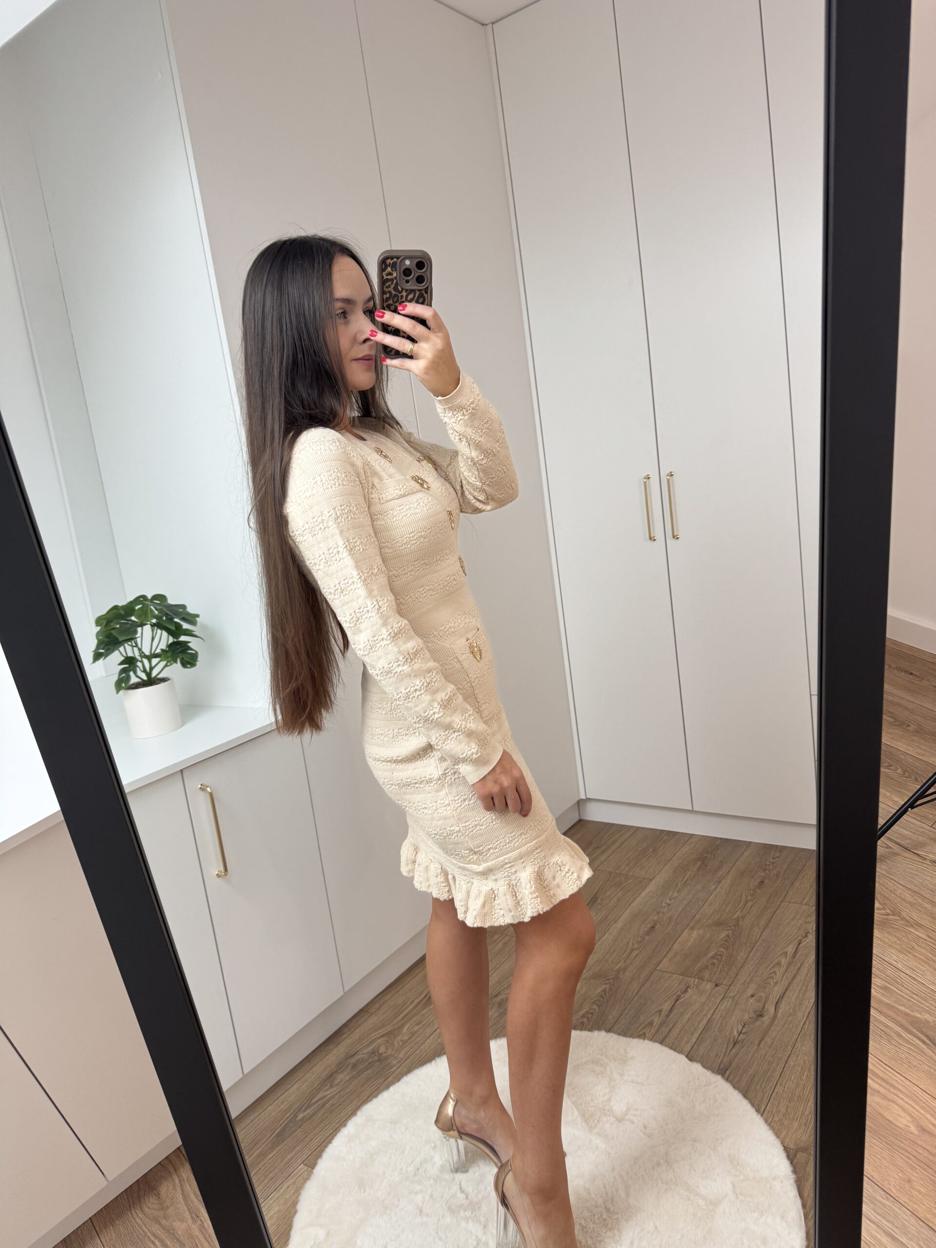 Sukienka z ozdobnymi guzikami w kolorze złota. Bardzo kobieca- przez swój taliowany krój.