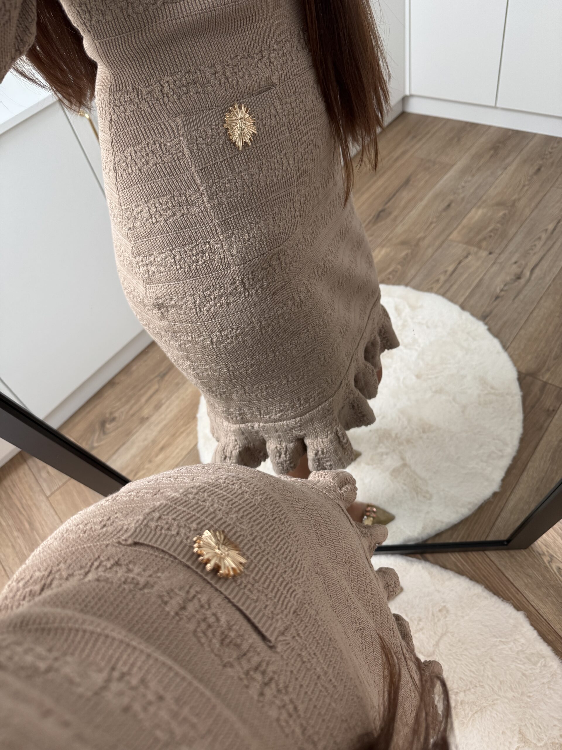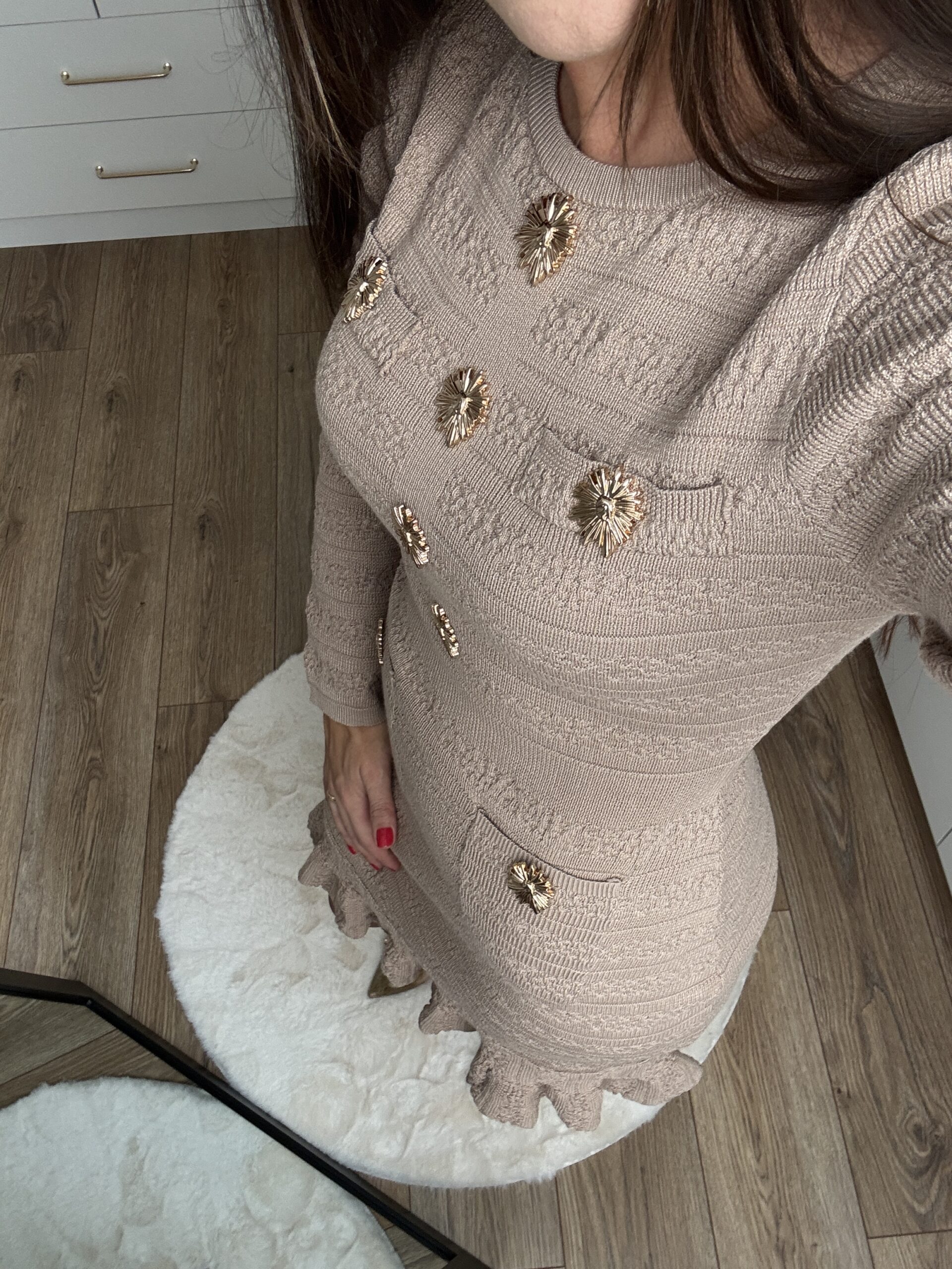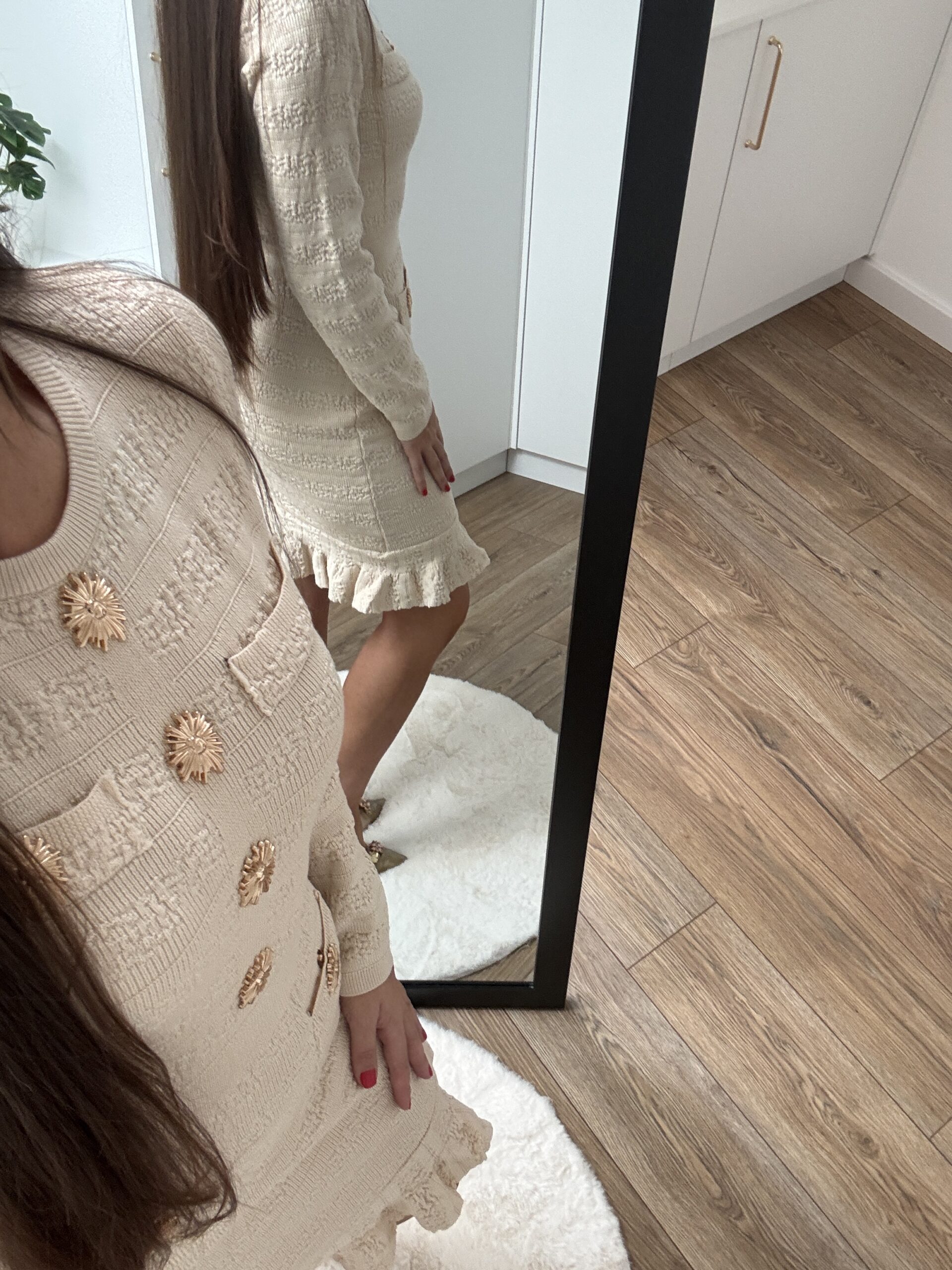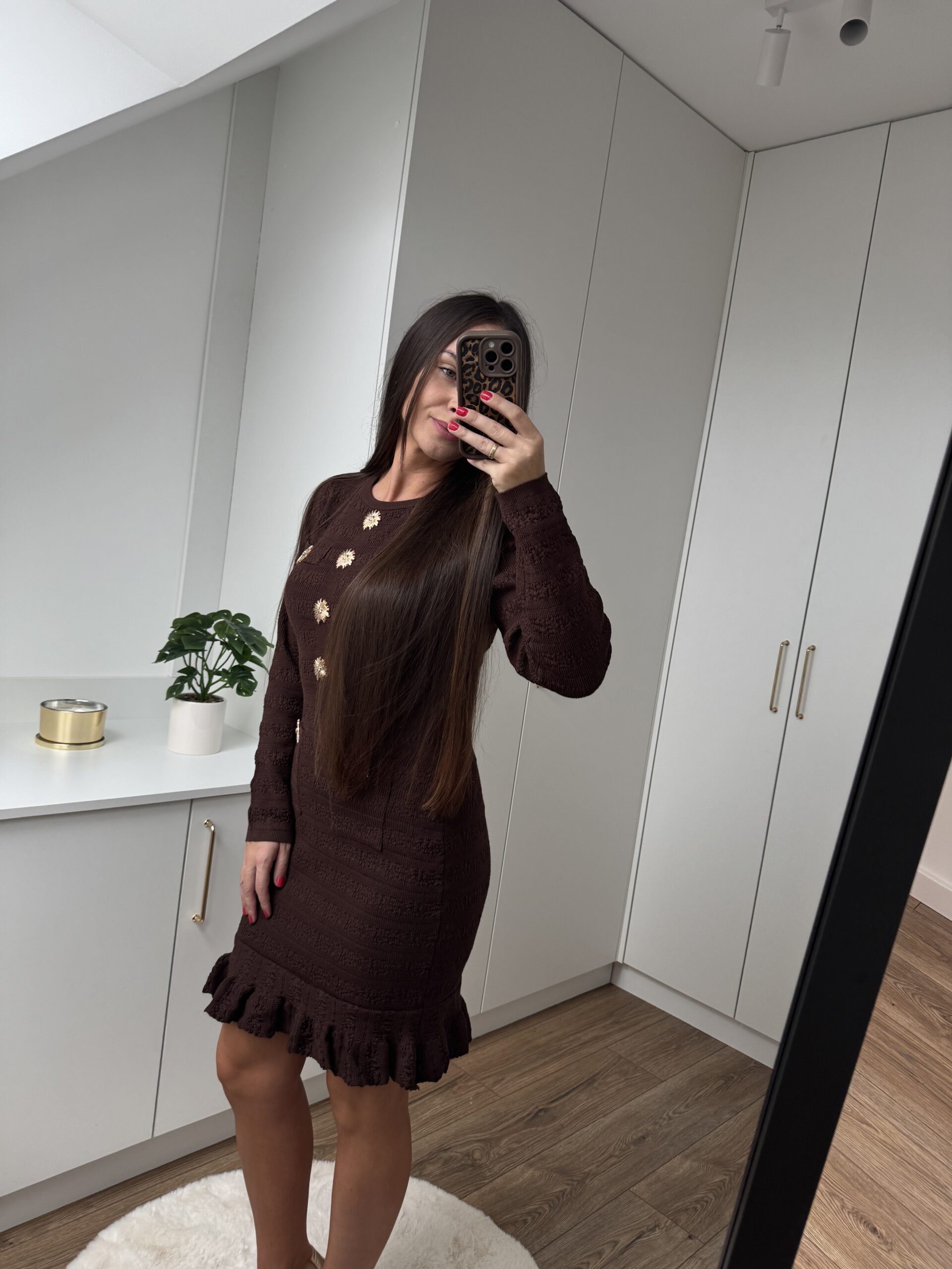 Sukienka z ozdobnymi guzikami w kolorze złota. Bardzo kobieca- przez swój taliowany krój.