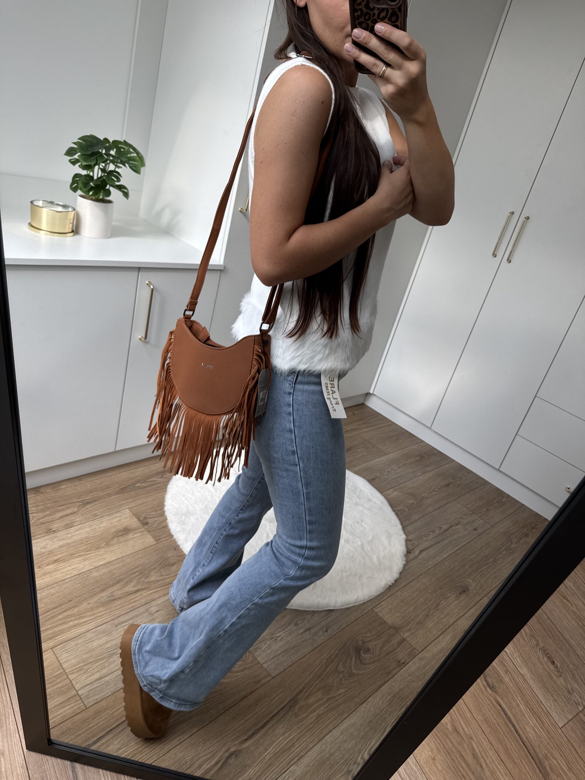 Torebka półksiężyc z ozdobnymi frędzlami.